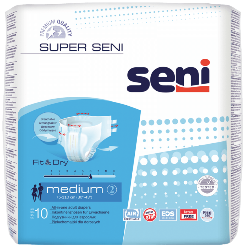 SENI SUPER Medium 2 N10 – это хорошая и проверенная защита при недержании. Предназначены как для активных людей, так и для людей с ограниченными двигательными возможностями.