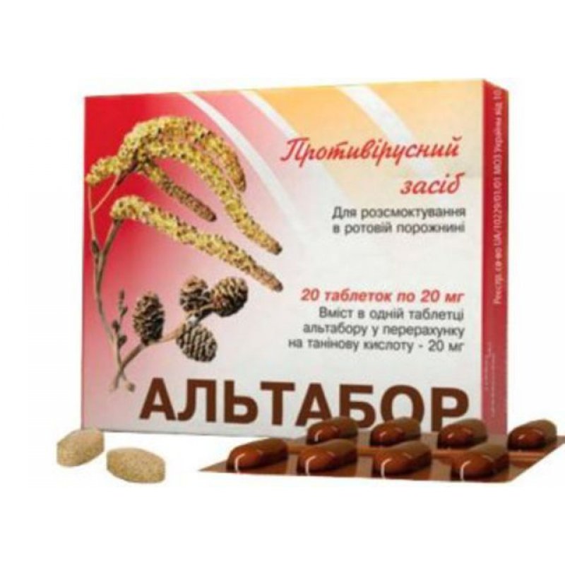 действующим веществом таблеток альтабора является субстанция сухого экстракта соплодий ольхи серой и ольхи клейкой, которая содержит смесь эллаготанинов моно- и олигомерного происхождения на основе фенолокислот (эллаговой, галловой, дилактон валониевой кислоты). Эти полифенольные соединения обладают выраженными противовирусными свойствами относительно вируса гриппа, везикулярного стоматита и простого герпеса. Механизм противовирусного действия альтабора заключается в индукции синтеза интерферона, угнетении активности нейраминидазы вируса гриппа, а также вирусспецифической тимидинкиназы вируса герпеса, что приводит к прекращению синтеза вирусной ДНК. Дополнительные фармакологические свойства альтабора — это широкий спектр антибактериального действия относительно грамположительных: Staphylococcus aureus, Bacillus subtilis и грамотрицательных: Escherichia coli, Pseudomonas aeruginosa, Proteus mirabilis, Klebsiella микроорганизмов. Выраженные антиоксидантные, противовоспалительные, мембраностабилизирующие и анальгезирующие эффекты усиливают фармакотерапевтические свойства препарата при лечении ОРВИ и гриппа, которые очень часто осложняются бактериальной инфекцией и сопровождаются воспалением и болью.