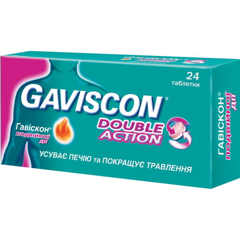 Гавискон® Двойного действия таблетки №24 применяют для лечения симптомов гастроэзофагеального рефлюкса, связанных с кислотностью содержимого желудка, забрасываемого в пищевод, таких как кислая отрыжка, изжога, расстройство пищеварения, например, после приема пищи или во время беременности.