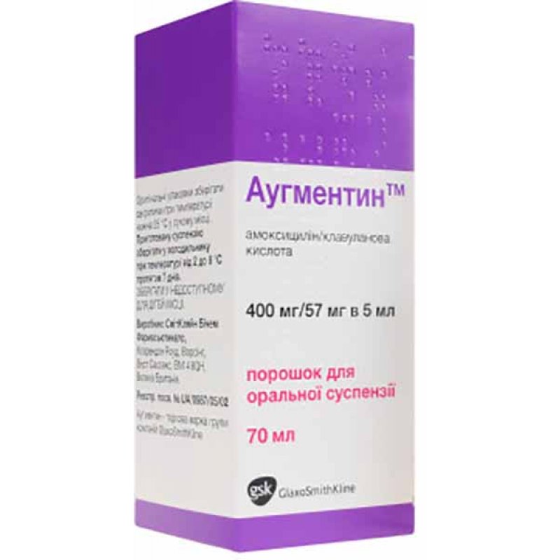 Аугментин порошок д/ор. сусп. 400 мг/57 мг/5 мл по 70 мл у флак.